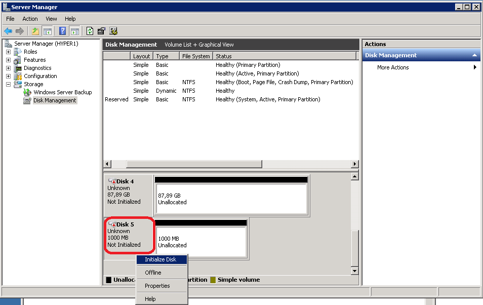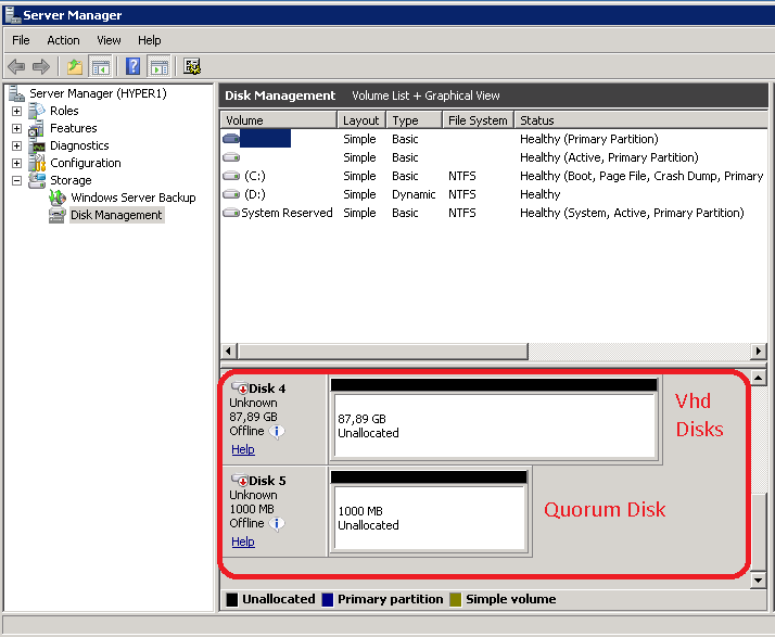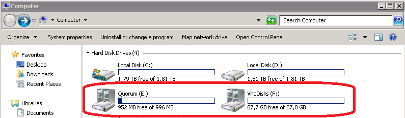 Görüldüğü gibi sanal sunucuların tutulacağı Vhd diski ile Quorum bilgisinin tutulacağı disk Hyper-V hostuna map olmuş durumda.Artık Hyper-V hostu bu diskleri kendi diskiymiş gibi kullanabilecek.Şimdilik diskleri yapılandırmıyoruz.Konfigurasyonlar yapılırken sırası gelince konfigure edeceğiz.