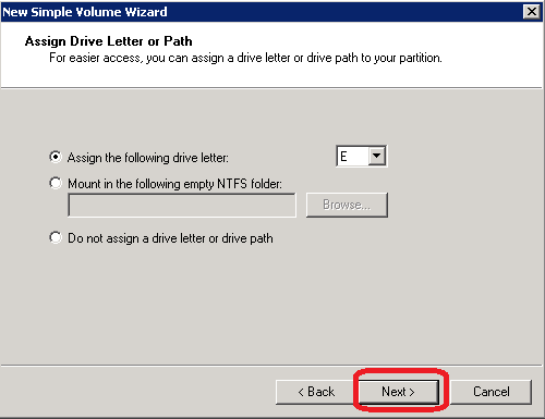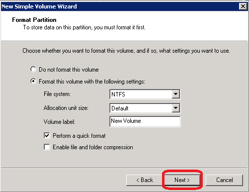 Diske herhangi bir isim verebilirsiniz.Diski biçimlendirmek için Next ile devam ediyoruz.