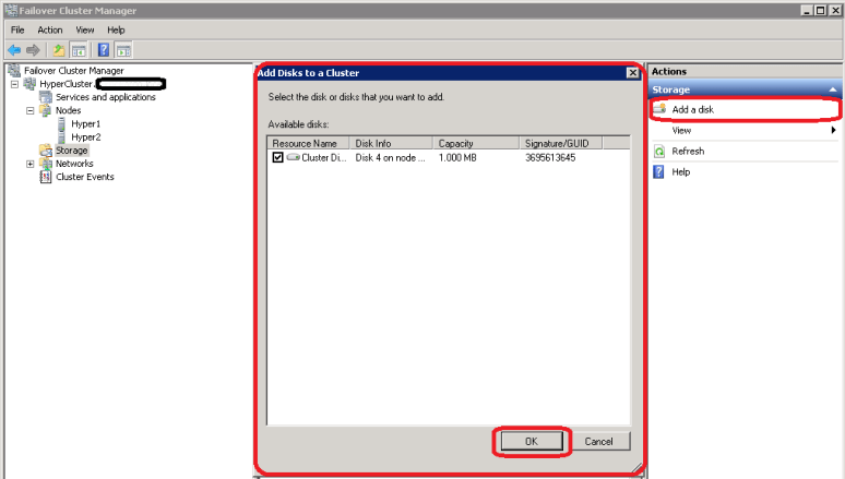 Storage kısmına disk eklemek için Add a disk diyoruz ve az önce yapılandırmasını yaptığımız Quorum diskini gösteriyoruz.