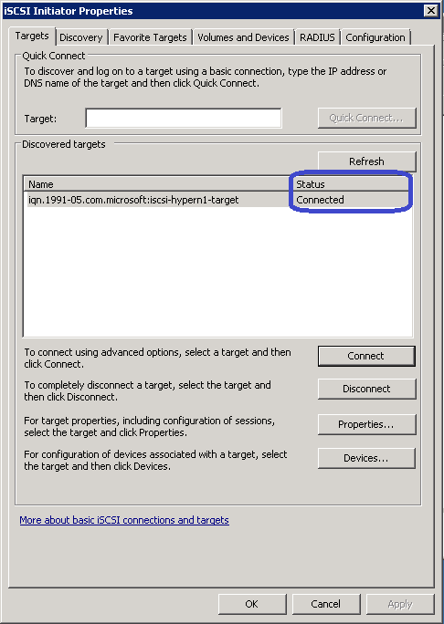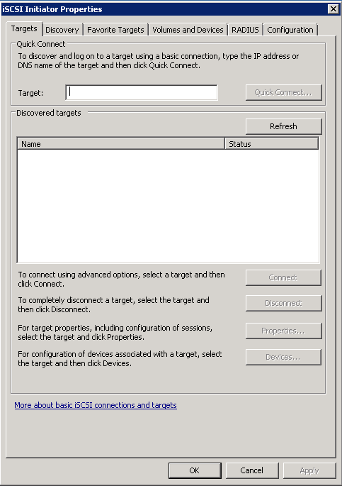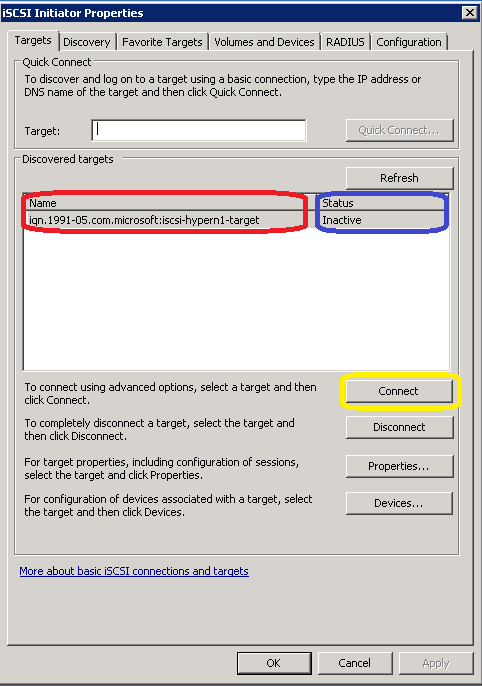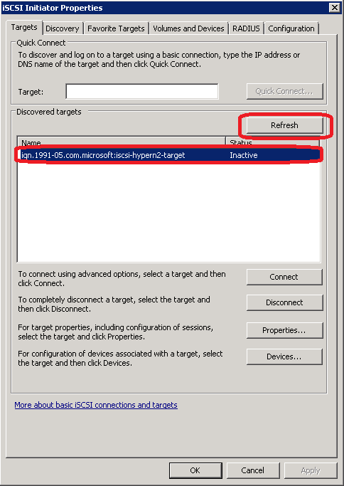 Targets tabına baktığımızda ilk başta herhangi atanmış bir volume bilgisi göremiyoruz.Halbuki ISCSI sunucusu tarafında Hyper-V nin disk isteğini kabul etmiştik.