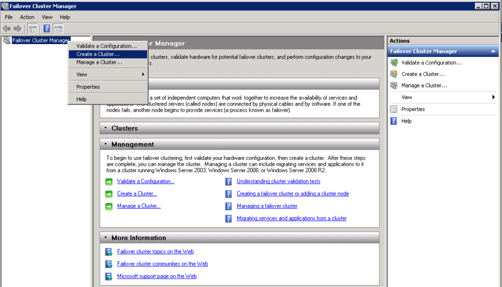 Administrative Tool içerisinden failover Cluster konsolunu açıyoruz ve yukarıdaki ekranda gözüktüğü gibi Create Cluster diyoruz.