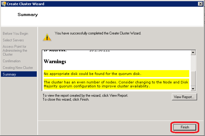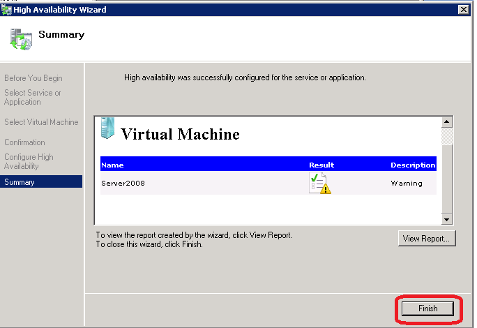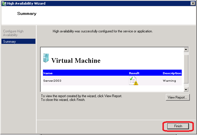Sanal sunucumuzun başarılı şekilde High Availability hale geldiği yazısını gördükten sonra Finish ile işlemi bitiriyorum.