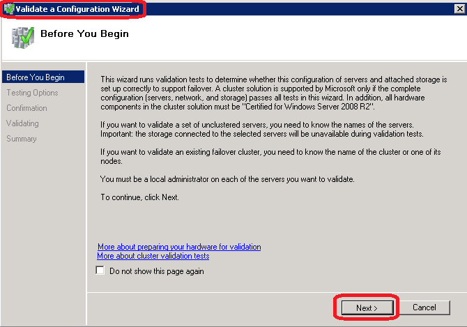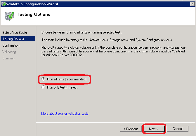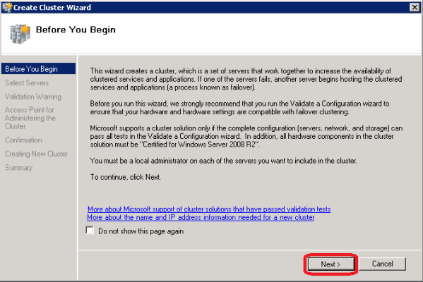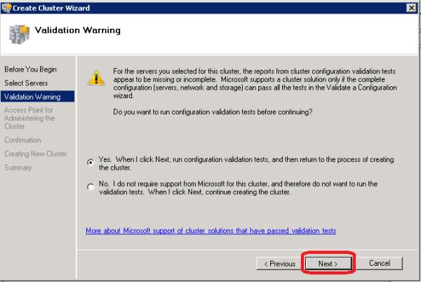 Kuruluma başlamadan önce cluster ile ilgili ön koşulları doğrulamakta fayda var.Zaten sistem bizi bunun için yukarıdaki şekilde görüldüğü gibi uyarıyor.Validate işlemi yaparak kurulumdan önce herhangi bir eksiklik ya da yanlışlık var ise bunu önceden görüp düzeltebiliriz.Yes ile validate işlemini onaylıyoruz ve Next ile devam ediyoruz.