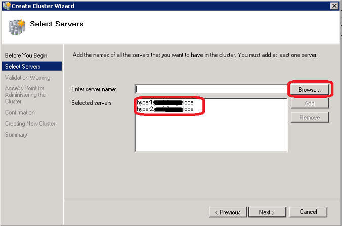 Cluster sistemini hangi sunuculara uygulayacağımızı belirliyoruz.Biz burada Hyper1 ve Hyper22 sunucularını Browse ile bulup ekliyoruz.Next ile devam ediyoruz.