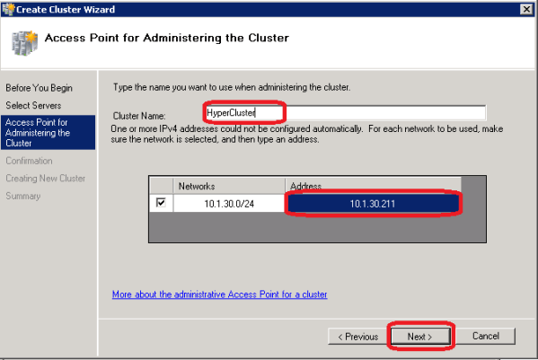 Burası önemli.Cluster için bir isim ve Ip tanımı yapmamız gerekiyor.Cluster ismine HyperCluster diyelim.Bu isim Active Directory tarafında domaindeki bir bilgisayar hesabı olarak gözükecektir.Bundan dolayı ismi verirken dikkat edin.Ip olarak Public Networkümüzden kimsenin kullanmadığı bir Ip veriyoruz ve bu bizim Clusterımızın Ipsi oluyor.Bu durmda;