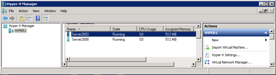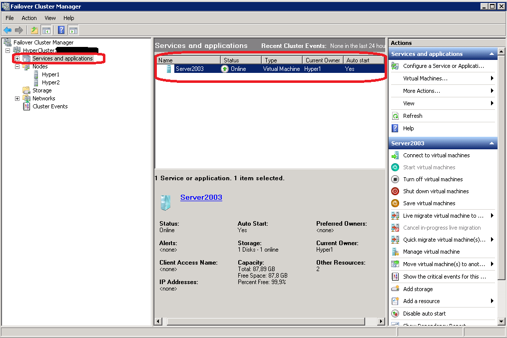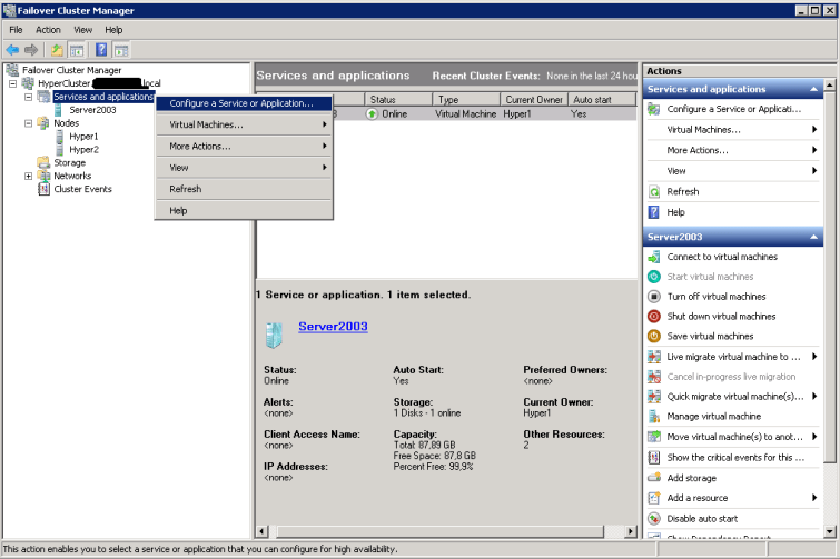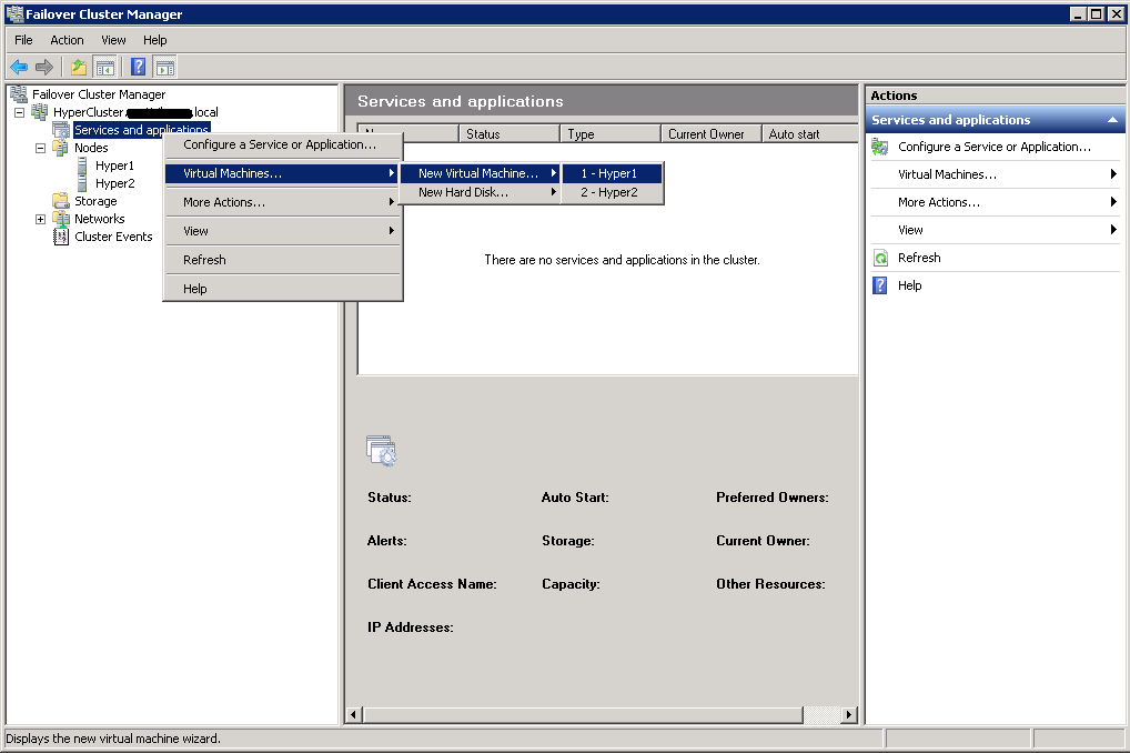 Evet clusterı oluşturduk , nodları ekledik , Quorum yapılandırmasını yaptık, fakat hangi uygulamayı clustera sokacağımızı belirlemedik.Biz Hyper-V cluster yapacağımız için şimdi Hyper-V servisini cluster yapısına sokacağız.Şu durumda Hyper-V üzerinde çalışan herhangi bir sanal makine yok.İki şekilde sanal makine oluşturma işlemi yapacağız.İlkinde Cluster konsolu üzerinden oluşturacak böylece doğrudan cluster olarak çalışmasını sağlayacağız.İkincisinde daha önceden hostlardan birinde oluşturulmuş olan sanal makineyi cluster içine sokacağız.