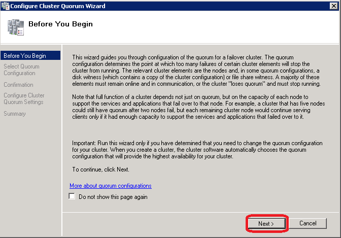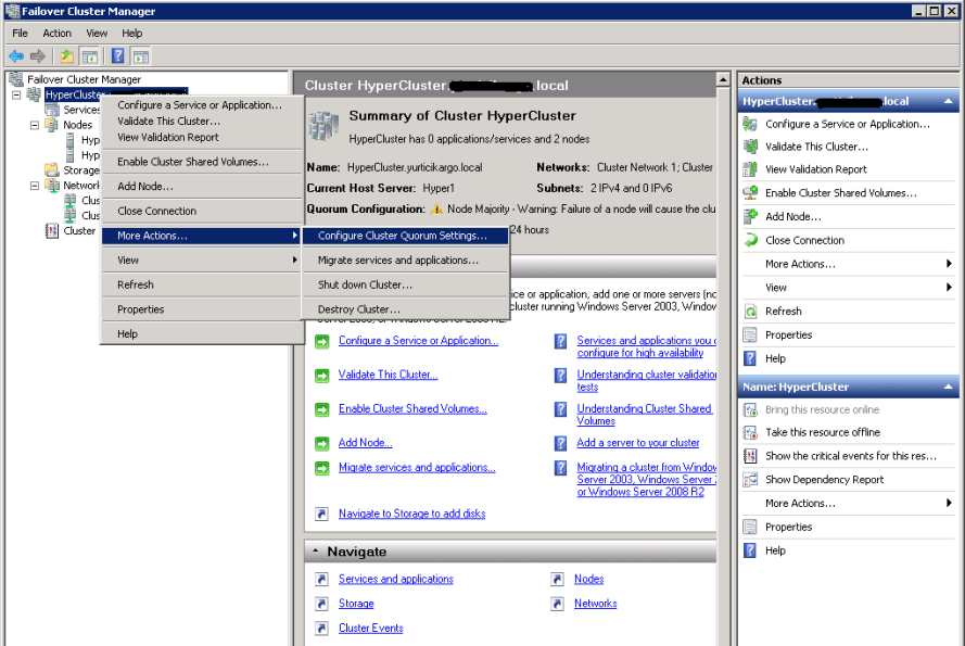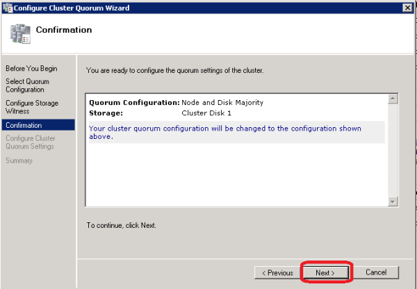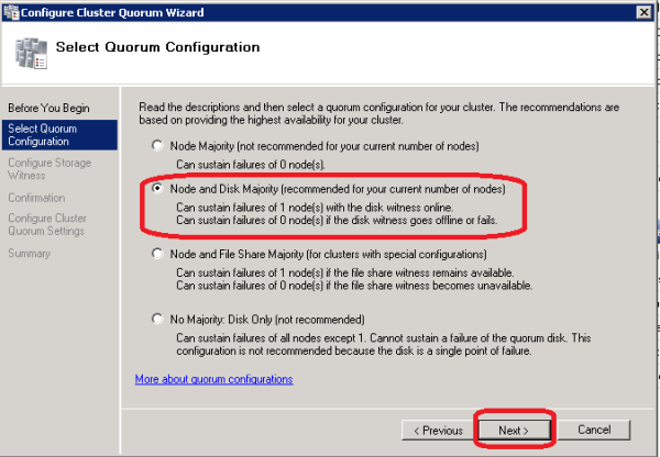 Kurulum işlemimiz sona erdi.Şimdi konfig işlemine başlayacağız.Zaten üstteki şekilde de Cluster üzerinde henüz bir konfig işleminin olmadığı uyarısı veriliyor.Şu durumda Cluster yapısı kuruldu ama cluster üzerinde herhangi bir servis tanımlanmadı.Servis tanımlamadan önce yani Hyper-V servisini cluster içine sokmadan önce Quorum konfigurasyonunu yapalım.