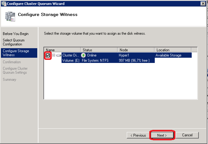 Az önce ‘Add a Disk’ diyerek konsol üzerinden eklediğimiz Quorum diskini seçiyoruz ve devam ediyoruz.
