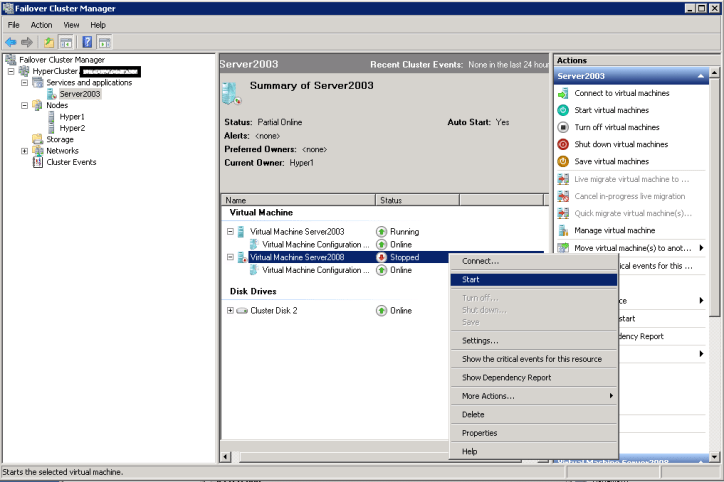 Service and Application içerisinde clustera dahil edilen sanal sunucular gözüküyor.Server2008 sunucusunu cluster yapısına koyarken kapattığımız için stop durumda bekliyor.Konsol üzerinden start komutuyla sunucuyu başlatabiliriz.
