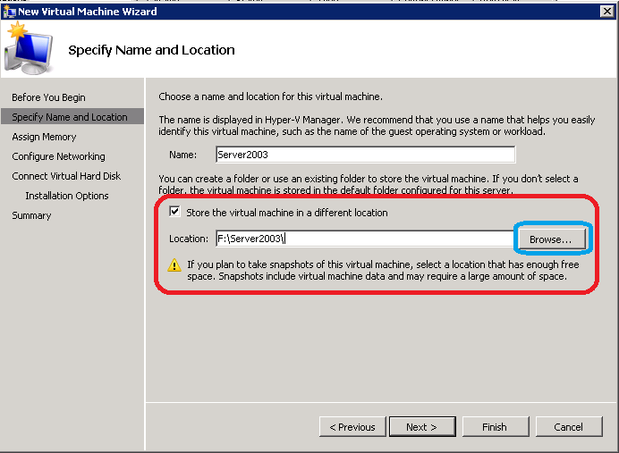 Sanal makine için konsol üzerinde gözüken herhangi bir isim verin.Ben server2003 verdim.Bu sanal makinenin nerede tutulacağını belirleyeceğiz.ISCSI sunucusu üzerinde oluşturduğumuz 90 GB lık alanı göstermemiz gerekiyor.Bu alanı daha önce Hyper1 hostu üzerinde yapılandırmamıştık.Sadece Quorum için olan 1 GB lık alanı Hyper1 üzerinde yapılandırmıştık.90 Gb lık olan alanıda Hyper1 hostu üzerinde yapılandırdım ve harf olarak da F atadım.Bu diski daha sonra Cluster konsolu üzerinden ‘Add a Disk’ diyerek ekledim.Bu işlemleri Hyper1 üzerinde Quorum diski için yapmıştım , bundan dolayı fazla ayrıntıya girmiyorum.F diskini içerisine Server 2003 isimli bir klasör oluşturdum ve yukarıda şekilde oluşturduğum sanal sunucuyu bu klasör içerisine koydum.
