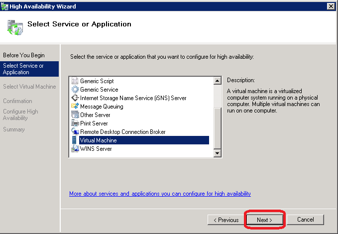 High availability olark hangi servisi seçeceğimizi yukarıdaki şekilden seçiyoruz.Biz sanal makineyi seçiyoruz.Burada farklı uygulama servisleride seçilip cluster yapılabilir.