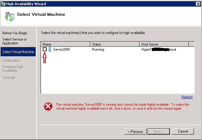 Devam etmek istediğimizde karşımıza sadece cluster yapısına alabileceğimiz Server2008 sunucus çıkıyor.Diğer sunucu olan server2003 sunucusu zaten cluster yapısında olduğundan onu göstermedi.Server 2008 i seçmek istediğimizde buna izin vermiyor.Bunu sebebi sunucusun açık olmasıdır.Sunucuyu kapalı halde cluster yapısına alabildiğimiz için kapatıyoruz.