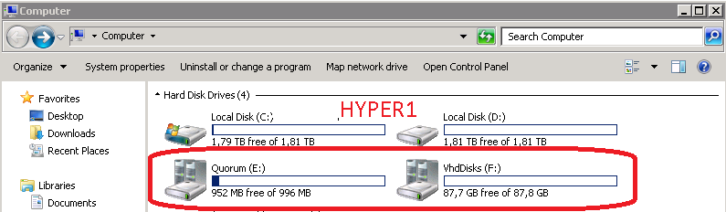 Yukarıdaki şekilde ise Hyper2 hostunun disk durumu var.Gördüğünüz gibi sadece system diski gözüküyor.Quorum ve VhdDisks şu anlık gözükmüyor.