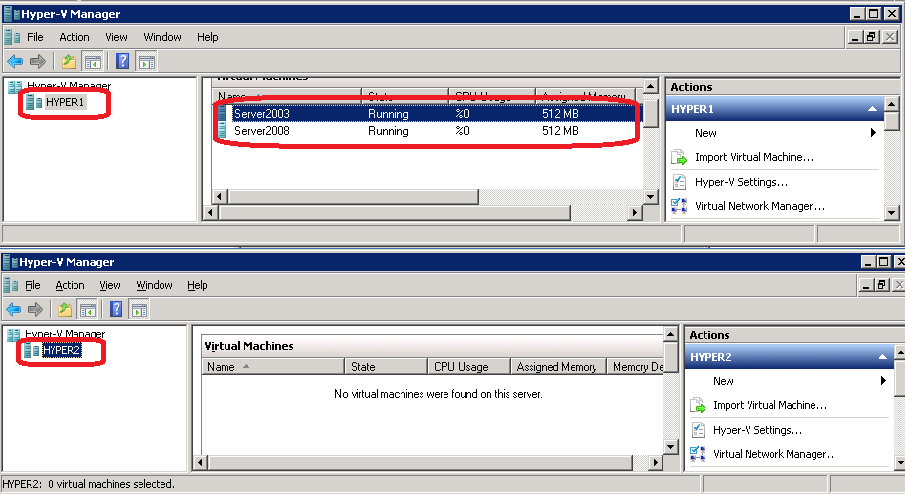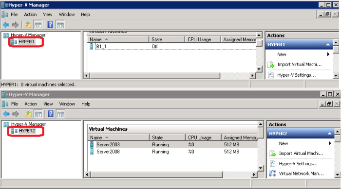 Yukarıdaki şekilde de Hyper-V Managerlara baktığınızda çalışan 2 sunucununda Hyper2 üzerinde olduğunu görebilirsiniz.