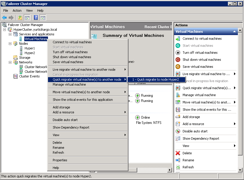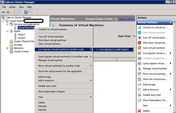 Makalenin başında söylediğim gibi Quick Migrationdan en büyük farkı kesintinin olmamamsıdır.Şu anda cluster üzerinde aktif olarak çalışan 2 adet sunucu var.CSV(Cluster Shared Volume) konfigurasyonunu yapmadığım için Live Migration sırasında hata verecektir.Yine de görmekte fayda var.