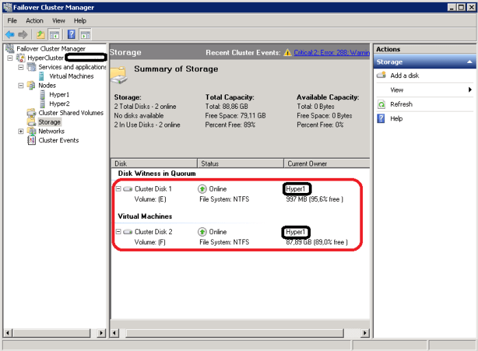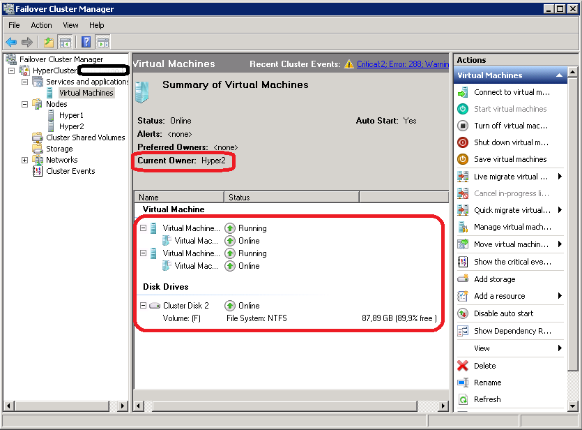 Hyper1 nodunu tekrar başlatııktan sonra sunucular otomatik olarak tekrar Hyper1 noduna geçmez.Eğer böyle birşey yapmak istiyorsanız tekrardan manuel olarak geri migration yapmalısınız.Burada dikkatinizi çekmek istediğim başka bir nokta var.Cluster Disk1 yani Quorum diskinin planlı migration sırasında yer değiştirmediğini söylemiştik.Plansız migration sırasında ise Quorum diski de yer değiştirir.Görüdğünüz gibi hyper1 nodunu kapattıktan sonra Quorum diski Hyper2 üzerine geçti.