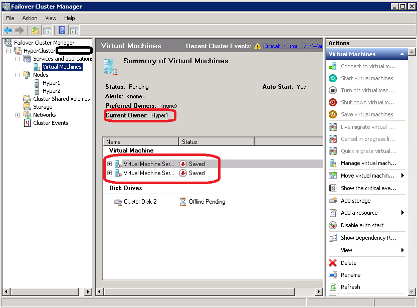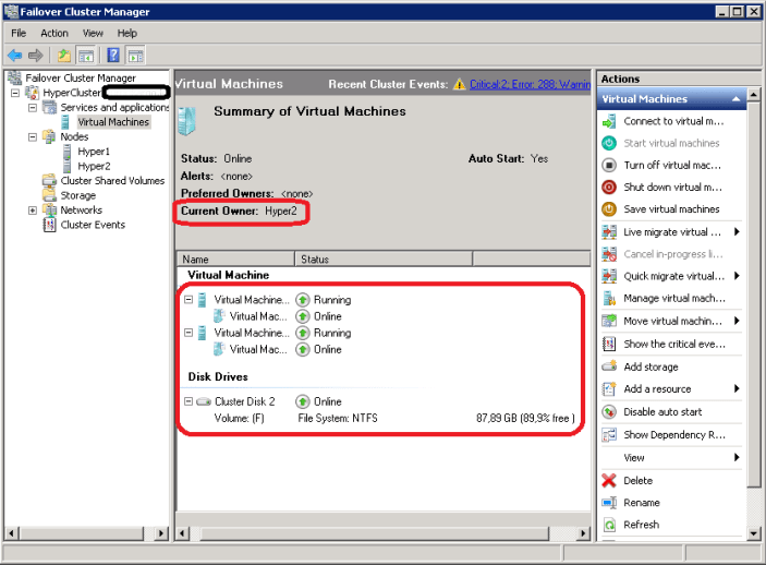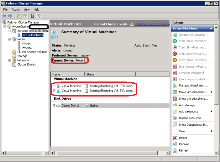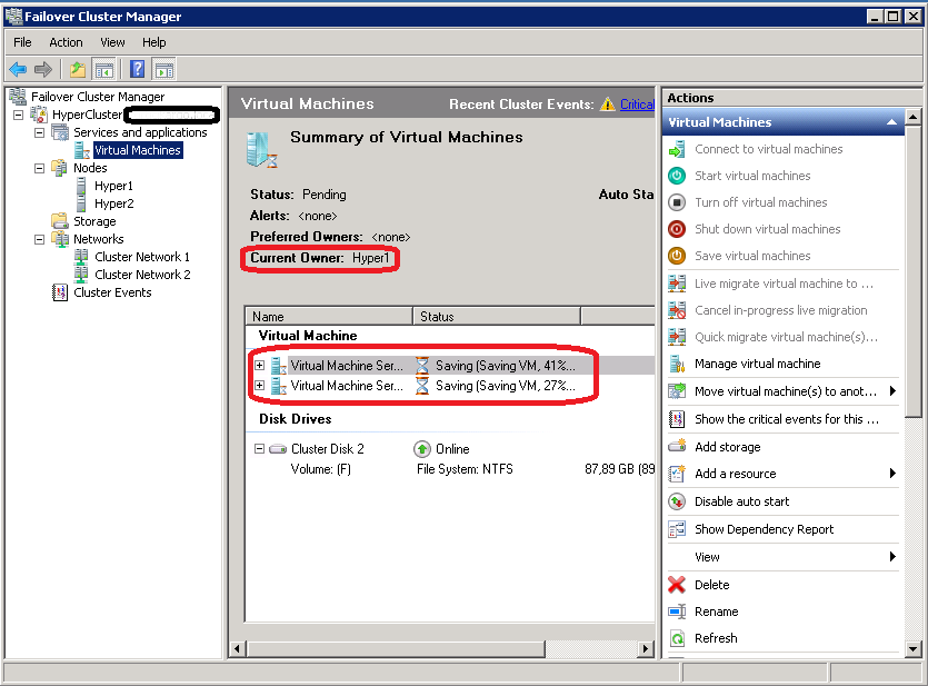Evet gördüğünüz gibi Hyper1 nodu down durumunda ve ownerlığı Hyper2 nodu alarak sanal sunucuları başlatıyor.