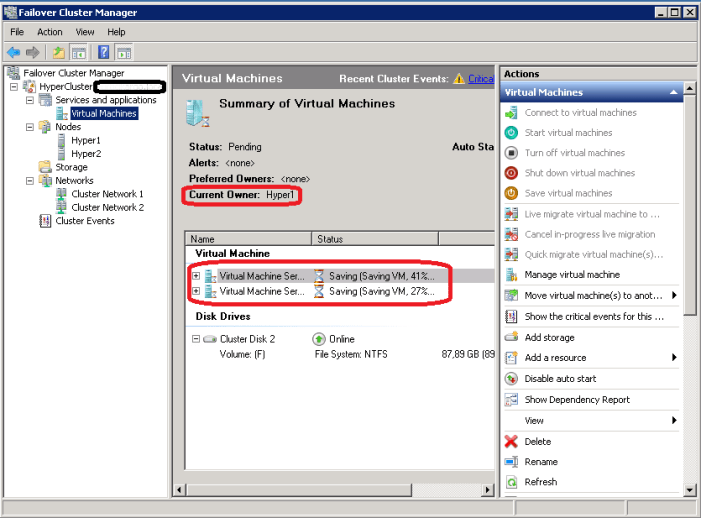 Quick Migration yapılırken önce migration yapılan node ‘saved state’ durumuna gelir.Bu sanal sunucuların o anki durumunun bir imajı olarak düşünebilirsiniz.Saved State durumundaki node bu durumunu BIN ve VSV doaylarına kayıt eder.Daha sonra bu dosyalar diğer noda taşınır ve bu sayede sanal makineler diğer node üzerinde kaldığı yerden devam eder.Taşınma süresine etki eden RAM miktarı BIN dosyasına kayıt edilir.Sanal sunucuya verilen RAM miktarı ne kadar fazla ise BIN dosyasının boyutu o kadar büyük olur ve haliyle taşınma süresi uzar.