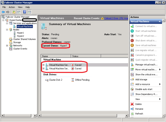 Şu anda bütün sunucuların hyper1 nodu üzerinde olduğunu düşünün.Ben manuel olarak Hyper1 nodunun elektriğini aniden kesiyorum ve durumu Hyper2 üzerindeki Cluster Konsolundan takip ediyorum.