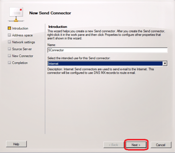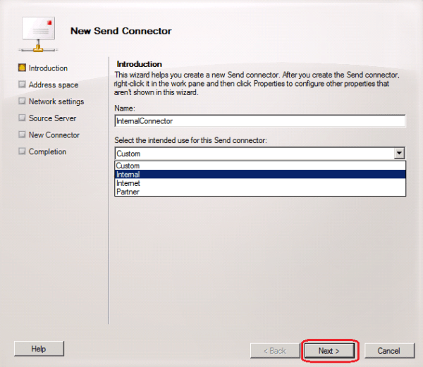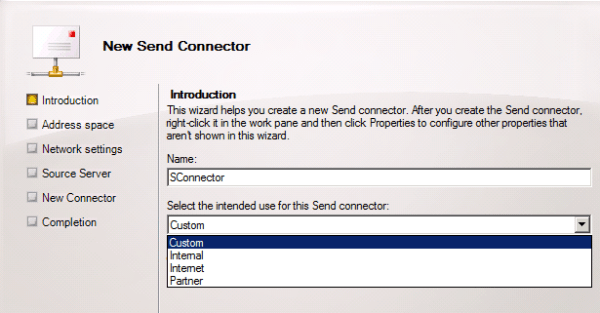 Internet:Organizasyon dışına yani internetteki herhangi bir yere mail atmak için seçilen seçenektir.Çoğunlukla kullanılan connector tipidir.Eğer ön tarafta bir SMTP Gateway ya da Edge Transport sunucunuz yok ise ve Exchange Server sunucunuz doğrudan dışarıya mail atıp dışarıdan mail alıyorsa bu seçenek seçilir.Bu durumda mx kaydı bulma işini üstlenen DNS ayarlarını Exchange sunucusu üzerindeki ethernette düzgün yapılandırmak gerekir.
