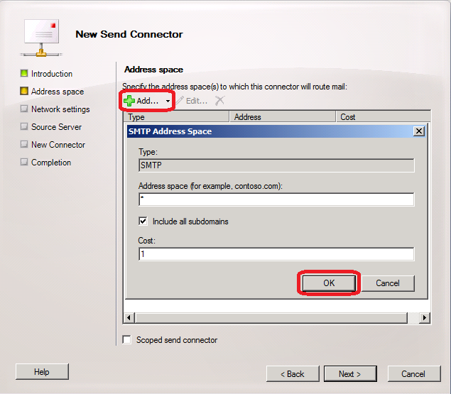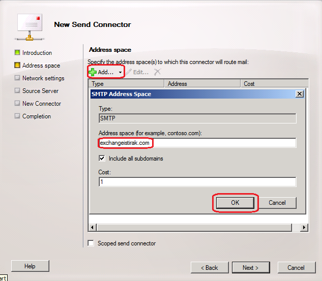 Yukarıdaki ekranda “Add” ile adres ekleme ekranına geliyoruz.Burada “Address Space” kısmına * koyuyoruz.Yani bu dışarıdaki herhangi bir domaine mail atılabilir demektir.Bu kısma örneğin microsoft.com yazsaydık kullanıcılar sadece microsoft.com’a mail atarken bu connectorü kullanacaklardı.”Include All Subdomains” seçerek bütün altdomainleri kapsadığını belirtiyorum.Burada başka bir ayrıntı da “Cost” değeri.Cost değeri sayesinde farklı connectorlerde bulunan aynı domainler için öncelik belirleyebiliriz.Yedeklilik açısından farklı Exchange Serverlara ait send connectorler kullanabiliriz ya da aynı domaini kapsayan birden fazla send connector bulunabilir.Böyle bir durumda mailin hangi send connectorü kullancağını “Cost” değeri ile belirleyebiliriz.Bu değer 1-100 arasında olabilir.1 en öncelikli değerdir.