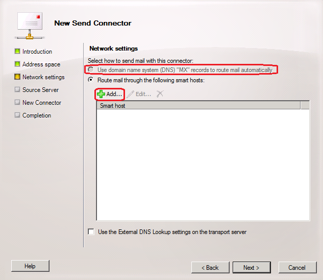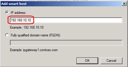 Yukarıdaki şekilde gözüktüğü gibi dış dünyaya mail atılmayacağı için birinci seçenek pasif halde geliyor.İkinci seçenek üzerinden “Add” diyerek iştirak firmanın Exchange sunucusun IP adresini aşağıdaki gibi giriyoruz.