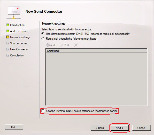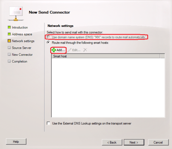 Eğer exchange server doğrudan dış dünyaya açıksa yani ön tarafta bir smtp gateway sunucusu yok ise ilk seçenek seçilir.Ön tarafta bir SMTP gateway varsa ikinci seçenek seçilir ve ilgili SMTP gateway sunucusunun Ip si oraya girilir.SMTP gateway sunucusunun olmadığını varsayıyorum ve ilk seçeneği seçiyorum.Böylece bu exchange sunucumuz dışarıya 25 portu ile çıkarak Mx kaydı arayacak ve MX kaydından dönen Ip ye maili atacaktır. Mx kaydı bulma işini biliyorsunuz DNS yapıyor.Burada exchange sunucuda bulunan ethernet üzerinde DNS ayarlarını yapıyoruz.Eğer başka bir DNS kullanmak istiyorsak yukardaki şekilde gözüken “Use the External DNS Lookup settings on the transport server” kutucuğunu işaretlememiz gerekir.Çok yoğun bir mail trafiğiniz var ise ve sadece bu mail sunucunuzun kullanacağı bir DNS server kullanmak istiyorsanız bu seçeneği kullanabilirsiniz.”External DNS Lookup” adresinin nereden girileceğini birazdan göstereceğim.
