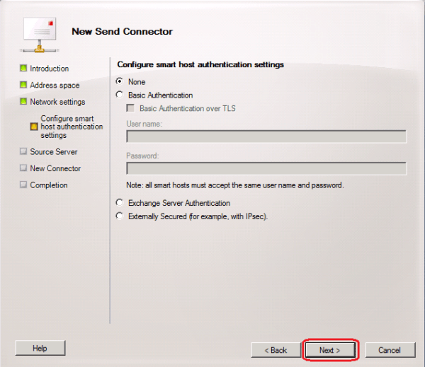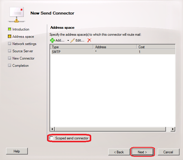 Yukarıdaki şekilde görülen başka bir ayrıntıdan bahsetmke istiyorum.”Scoped send Connector” kutucuğunu seçmezsek eğer bütün forest yapınızdaki Exchange Serverlar bu send connectorü kullanabilir.Kutucuğu seçerek limit koyabilir ve sadece bu connectorü aynı Active Directory Site içindeki Exchange Serverların kullanmasına izin verebiliriz.Next ile devam ediyoruz.