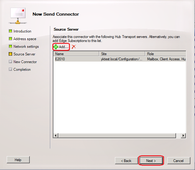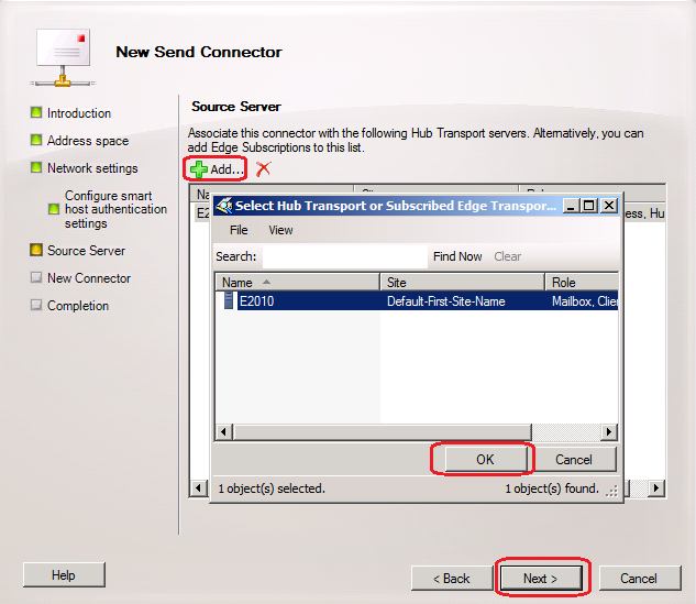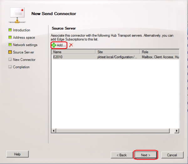 Yukraıdaki şekilde bu connectorü hangi Hub Transport rolüne sahip Exchange sunucularının kullanacağını seçebiliriz.Burada eğer birden fazla Hub Transport rolüne sahip Exchange sunucunuz var ise seçiminizi birden fazla yapıp bir nevi yedekleme yapabilirsiniz.Örneğimizde bütün rollerin tek bir sunucuda olduğu exchange sunucumuzu seçip devam ediyoruz.