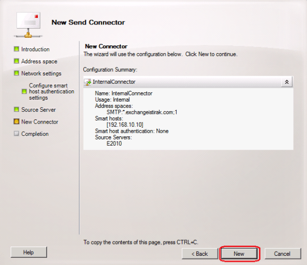 Yukarıdaki örenğimizde internete mail atmak için geerekli olan send connector ayarlarını göstermeye çalıştım.Şimdi de başka bir konfigürayonumuz olduğunu varsayalım ve başka bir send connector oluşturalım.Diyelim ki şirket networkümüz büyük ve içeride birden fazla Exchange sunucularımız var.Bu durumda dış dünyaya gidip public ortamda mx kayıtlarını aratmak yerine Internal bir send connector oluştururuz ve içerdeki diğer Exchange sunucular ile olan mail alış-verişinin içeride olmasını sağlarız.İşlem adımlarını inceleyelim.