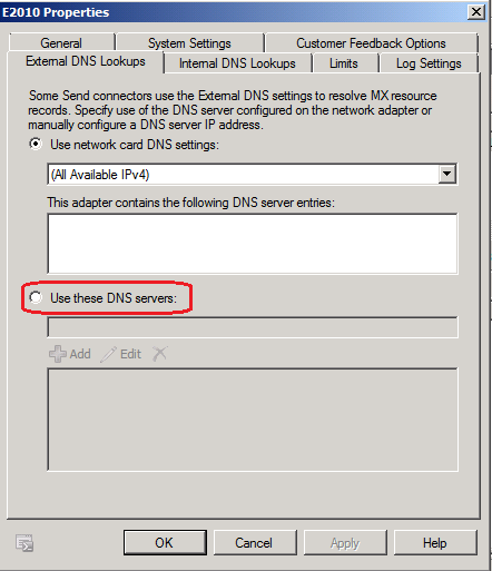 “External DNS Lookups” tabından “Use these DNS servers” diyerek bir ya da birden fazla DNS adresi gireriz ve Exchange Sunucumuzun DNS işlemlerini o adreslerden yapmasını sağlayabiliriz.