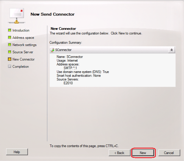 “Organization Configuration” içerisinden “Send Connectors” üzerinden send connector oluşturabiliriz.Yeni bir send connector oluşturmak için “New Send Connector” diyoruz.