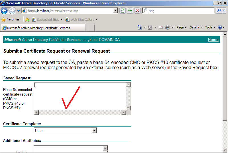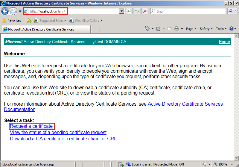 İç networkteki sertifika sunucunuz neredeyse o sunucuya gelip browser üzerine http://localhost/certsrv yazıyoruz ve yukarıdaki ekranla karşılaşıyoruz.”Request a certificate” diyerek devam ediyoruz.