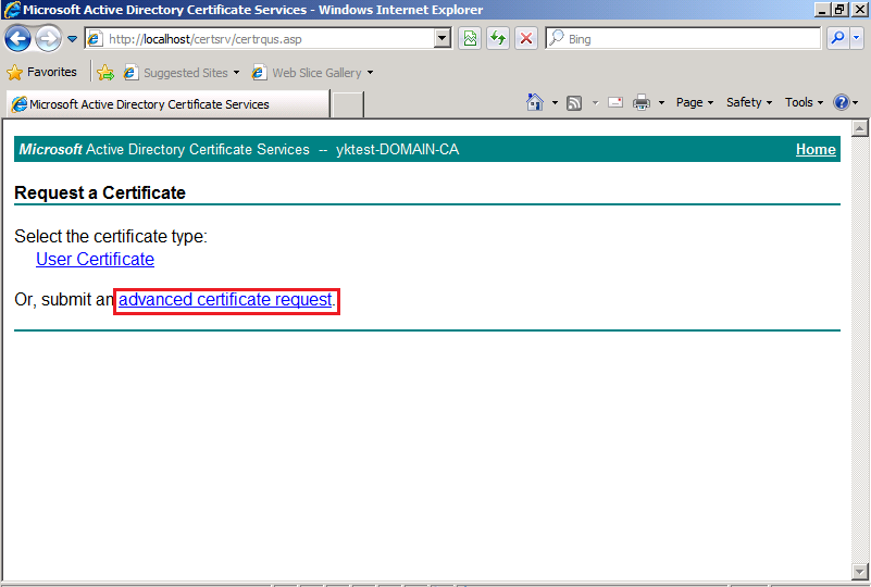 Yukarıdaki ekrandan “advanced certificate request” diyerek devam ediyoruz.