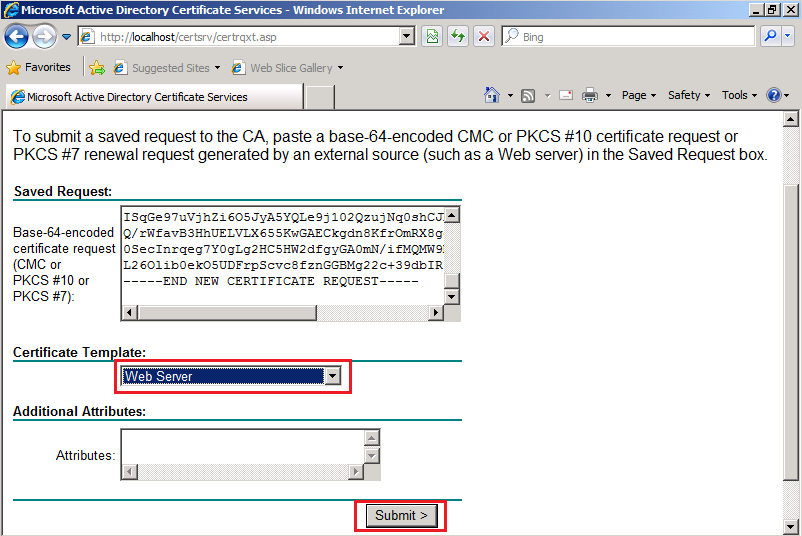“Certificate Template” kısmında da Web Server seçip Submit diyerek devam ediyorum.