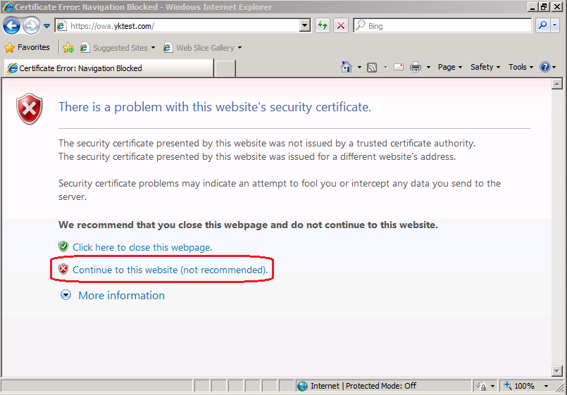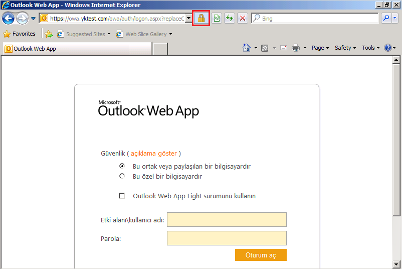 Dış networkten https://owa.yktest.com olan owa adresini girdiğim zaman gördüğünüz gibi sertifika ile ilgili uyarı vermektedir.”Continue to this website” dediğimiz zaman sertifika güvenilirliğini yok sayıp uygulamaya erişebiliriz.