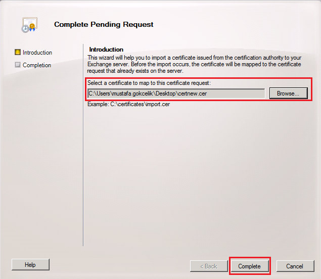 Sertifika sunucumuzdan oluşturduğumuz ya da Global Sign gibi sertifika firmasının bize yolladığı .cer uzantılı sertifikayı Exchange Sunucumuza göstermek için yukarıdaki gibi “Complete Pending Request” diyoruz.