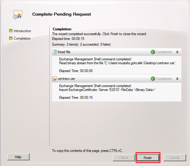 BROWSE diyerek .cer uzantılı sertifikamızı gösteriyoruz ve COMPLETE diyerek işleme devam ediyoruz.