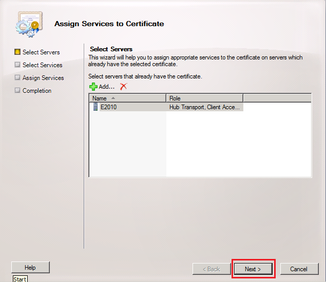 Yukarıdaki şekilden bu sertifikanın hangi servisler için kullanılacağını seçebilirsiniz.Sertifika oluşturma ekranında hatırlarsanız sertifikayı hangi uygulamalar için kullanacaksak o uygulamalar için tanım yapmıştık.Burada da o uygulamaları çalıştıran servisleri seçiyoruz.Test ortamımda “Unified Messaging” kurulu olmadığı için o hariç diğerlerinin hepsini seçiyorum ve NEXT ile devam ediyorum.
