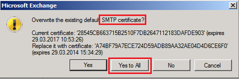 SMTP için atanmış bir sertifika bulunduğunu ve yeni oluşturduğumuz sertifika ile değiştirmek isteyip istemediğimizi soruyor.”Yes to All” diyerek bütün servisleri bu yeni sertifika üzerine atıyorum.