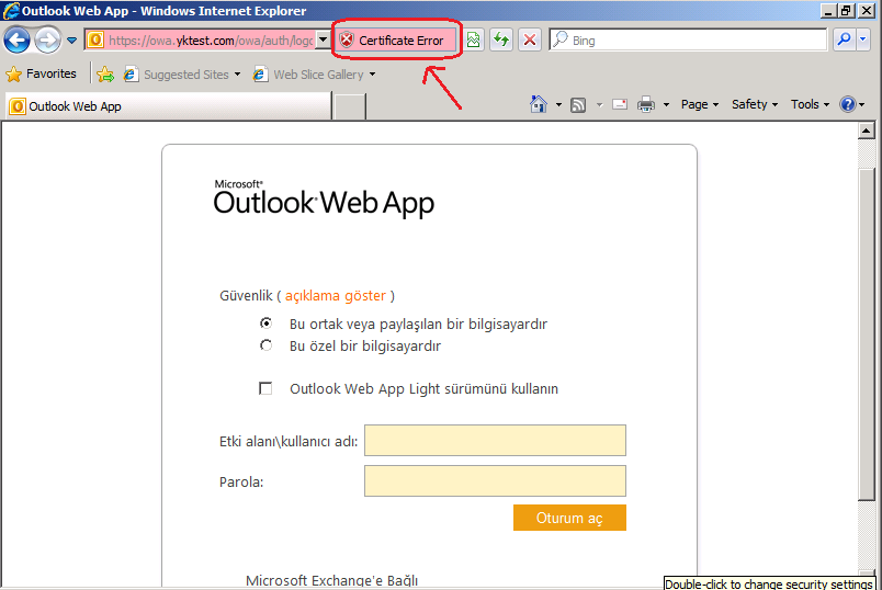 Şimdi test olması açaısından Browser üzerinden Exchange Sunucuya bağlanalım bakalım aynı uyarıyı verecek mi?Ben test oretamında sertifikamı iç networkteki sertifika sunucusundan (CA) oluşturduğum için testimide iç networkten yapıyorum.