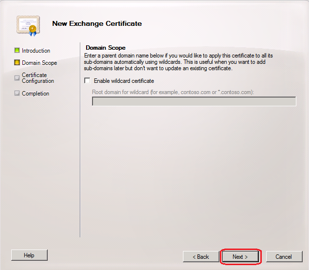 Subdomainleriniz varsa ya da OWA yı intranet.yktest.com ve internet.yktest.com şeklinde kullanmak isterseniz “Wildcard Certificate” özelliğini aktif etmelisiniz.Fakat bu pek tercih edilen bir yöntem değildir.Böyle bir durum için genellikle SAN (Subject Alternative Name) kullanılır.Birazdan buna da değineceğiz.Subdomainiz yoksa sizde benim gibi işaretlemeden geçebilirsiniz.