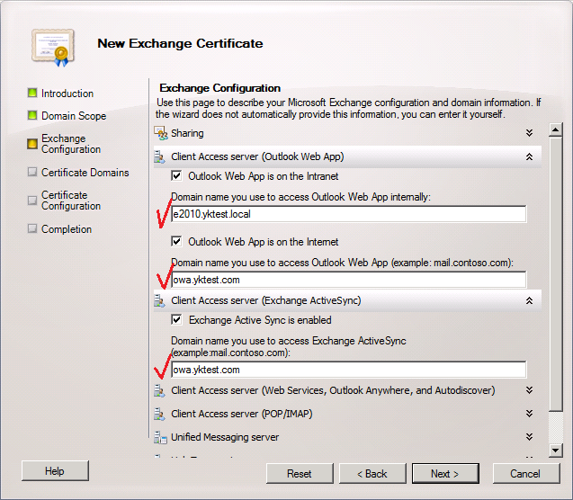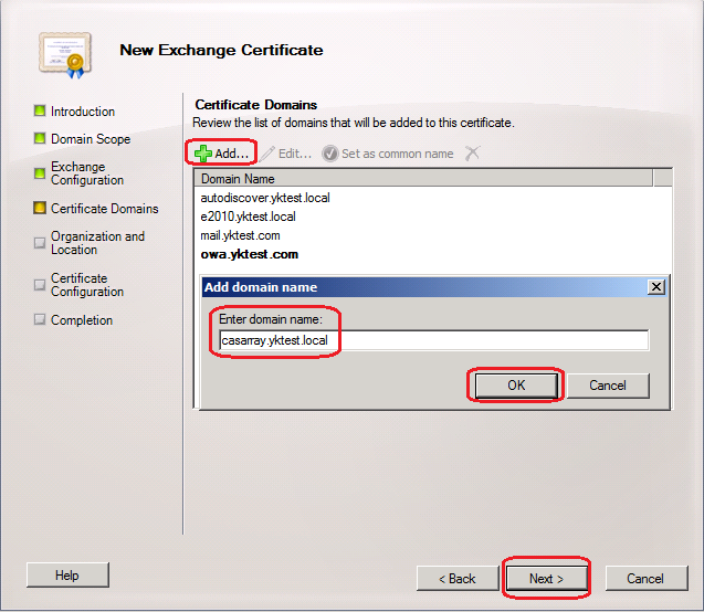 Yukarıdaki şekilde ise kullanacağınız domain isimlerini giriyoruz.Dışarıdan kullanıcıların hangi isimle girmesini istiyorsanız “Set as common name” olarak belirtin.Bu kısımda ayrıca client access rolünü üstlenen sunucunun FQDN ismini de girmelisiniz.Yukarıdaki örnekte ben client access rolüne sahip sunucunun ismi olan casarray.yktest.local ismini de listeye ekledim.Eğer bu ismi eklemezseniz kullanıcılar şirket içinde outlooklarını açtıkları zaman sertifika uyarısı ile karşılaşırlar.Bütün roller tek sunucu üzerindeyse haliyle exchangesunucuismi.domainsimi.local olan FQDN ismini yazmanız gerekir.Bu özellik güvenilir sertifika veren kurumlar tarafından SAN (Subject Alternative Name) olarak dikkate alınır.Bazı kurumlar SAN desteği vermiyor.Sertifika alırken ilgili kuruma SAN desteğinin olup olmadığını sormanızda fayda var.