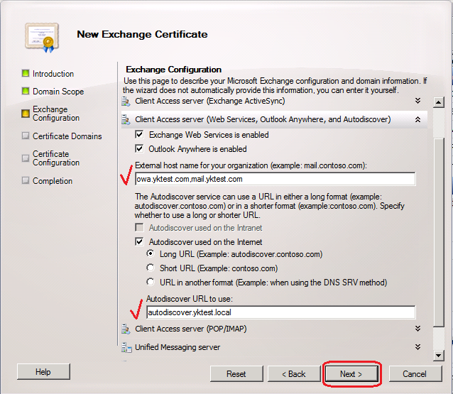 Bir diğer uygulama da Outlook Anywhere ve AutoDiscover uygulamasıdır.Outlook Anywhere özelliğinin hangi amaçla kullanıldığını bilmiyorsanız buradan bakabilirsiniz. Autodiscover özelliği sayesinde ise kullanıcıların sunucuya bağlantıları sırasında otomatik olarak login bilgilerine göre sunucunun ve mailboxın bulunması gibi işlemleri yapar.Bu özellikler içinde oluşturacağım sertifkayı kullanmak istiyorum.Bu kısmlara dilerseniz iç ve dış network için ayrı tanım yapabilirsiniz.Örneğin hem owa.domainsimi.com hem de mail.domainismi.com diye kullanmak isterseniz virgül ile ayırarak iki şekilde de tanım yapabilirsiniz.