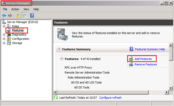 Yukarıdaki şekilde gözüktüğü gibi Exchange sisteminin kurulu olduğu sunucuya gelip”Server Manager” dan “Features” e geliyoruz ve sağ taraftan “Add Features” diyoruz.