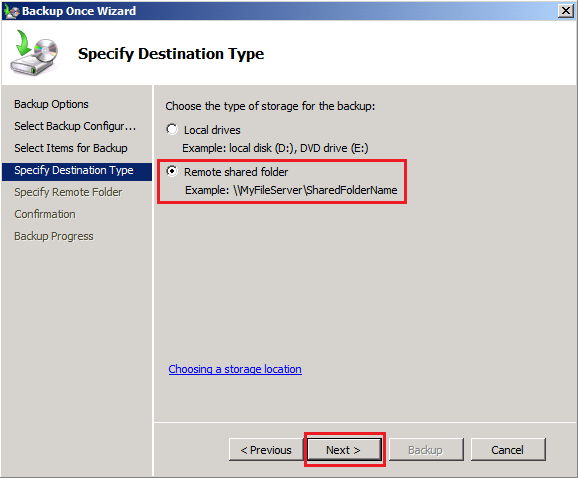 Exchange yedeğini nereye alacağımızı soruyor.Yedeği sunucunun diğer disklerine ya da networkte bir paylaşım klasörüne koyabilirsiniz.Ben networkteki bir klasöre yedeği alacağım için “Remote Shared Folder” seçeneğini seçip NEXT ile devam ediyorum.