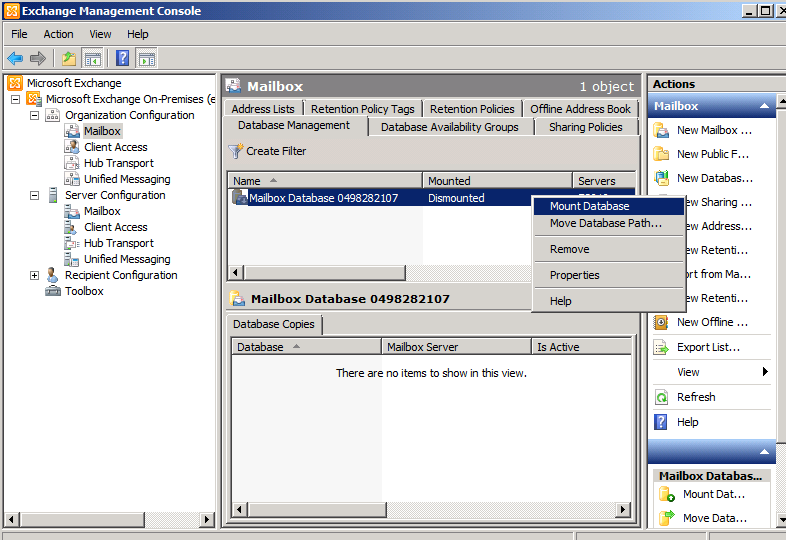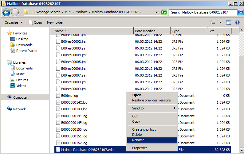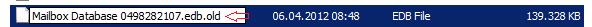 “C:\Program Files\Microsoft\Exchange Server\V14\Mailbox\Mailbox Database 0498282107” yolundaki uzantısı .edb olan database dosyamızın ismini değiştiriyorum ki bir daha mount edemeyelim.