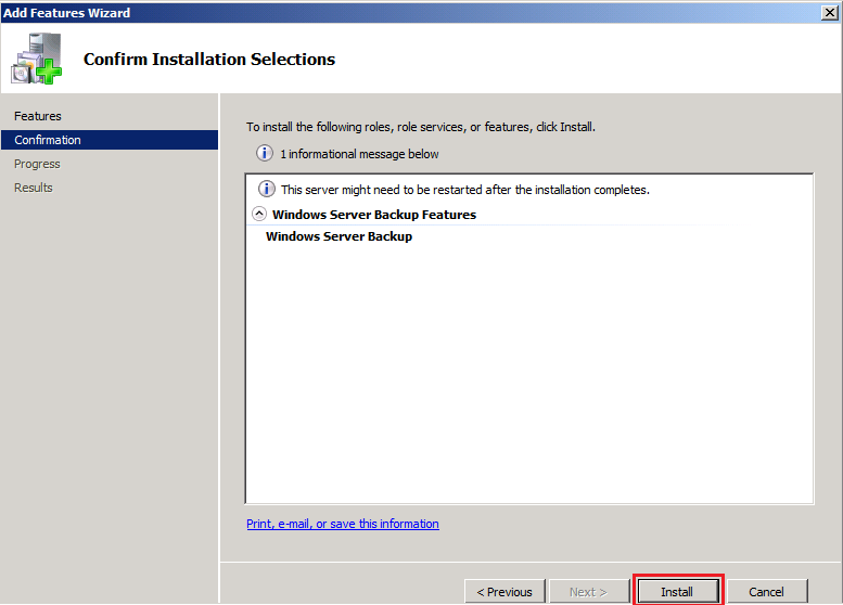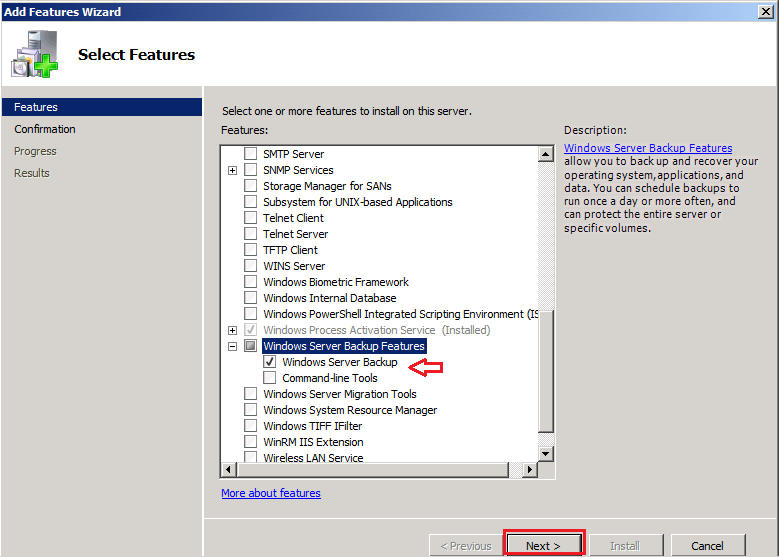 Yukrarıdaki gelen ekrandan “Windows Server Backup Features” özelliğini seçip NEXT ile devam ediyoruz.PowerShell üzerinden komut ile işlem yapacaksanız “Command-line Tools” özelliğini de seçebilirsiniz.