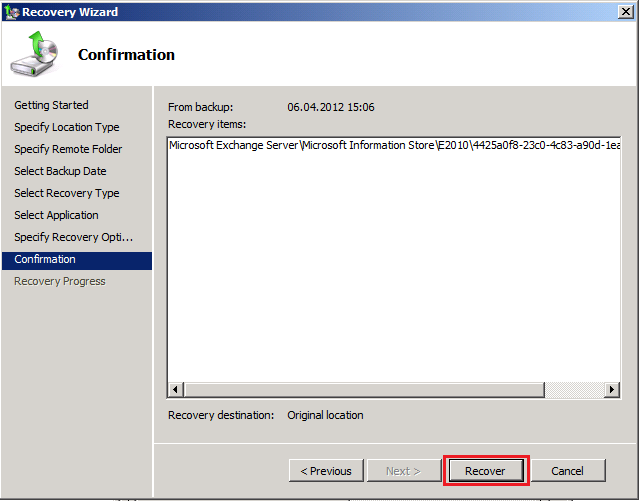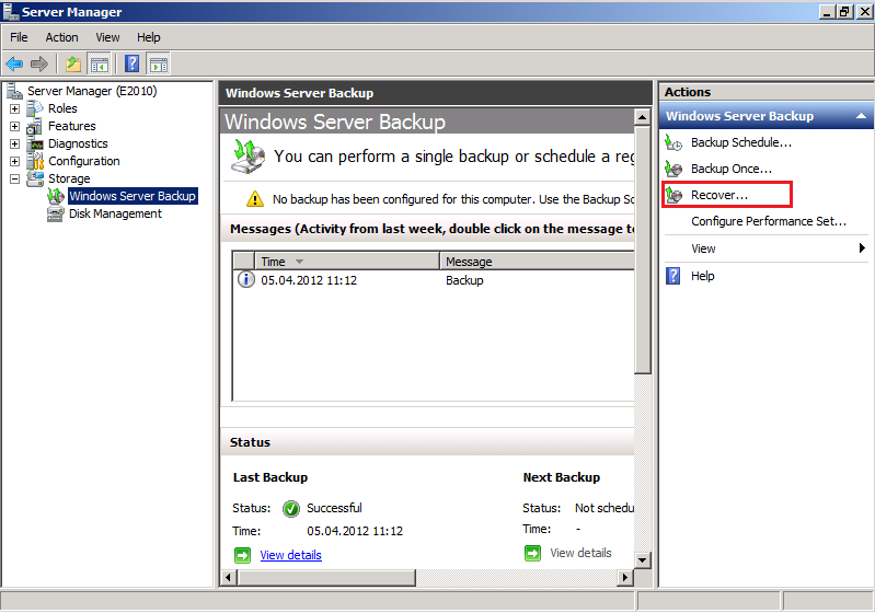 Yukarıdaki “Server Manager” ekranından “Recover” ile çökmüş olan Exchange Database için geri dönüş işlemine başlıyoruz.