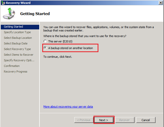 Daha önce aldığımız backupın nerede olduğunu soruyor bize.Backupı biz başka bir sunucudaki network paylaşım klasörüne almış olduğumuz için “A backup stored on another location” seçeneğini seçiyorum.Backup aynı sunucudaki farklı bir diske alınmış olsaydı üstteki seçeneği seçebilirdik.